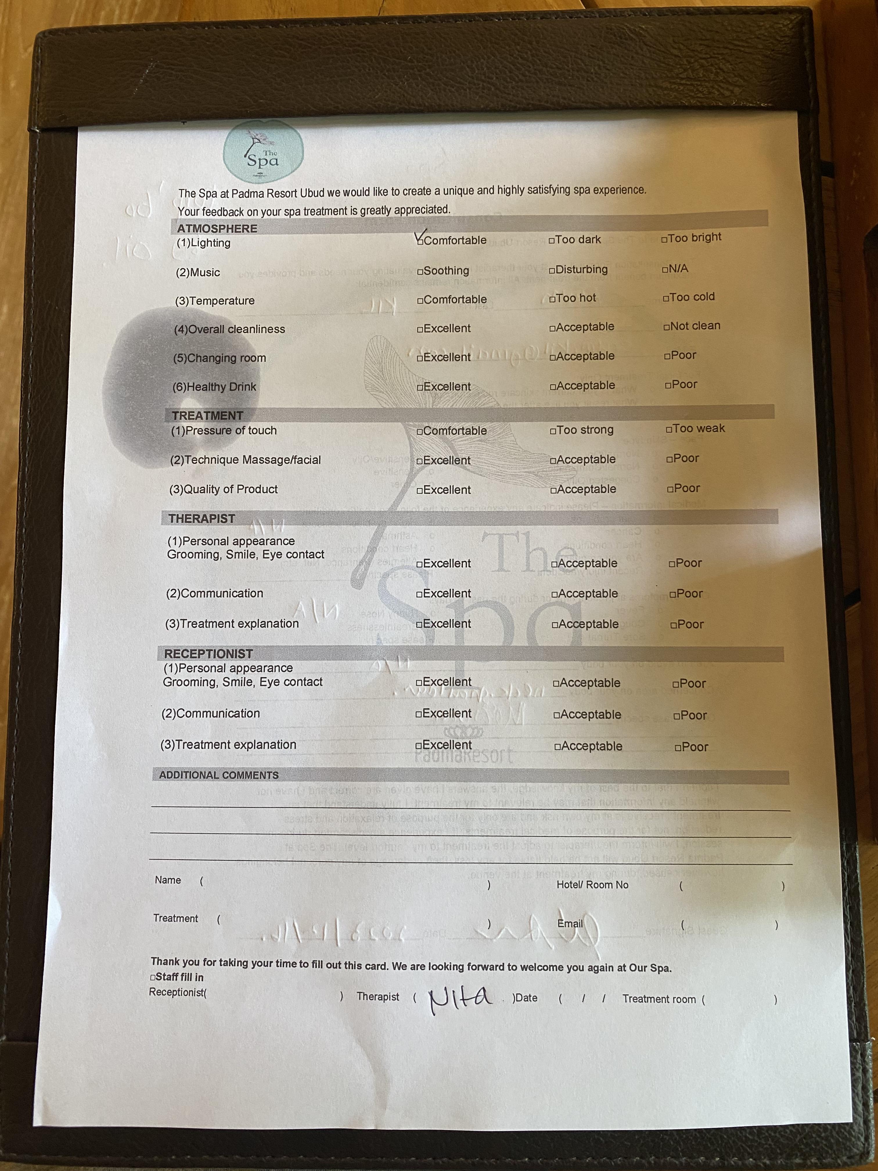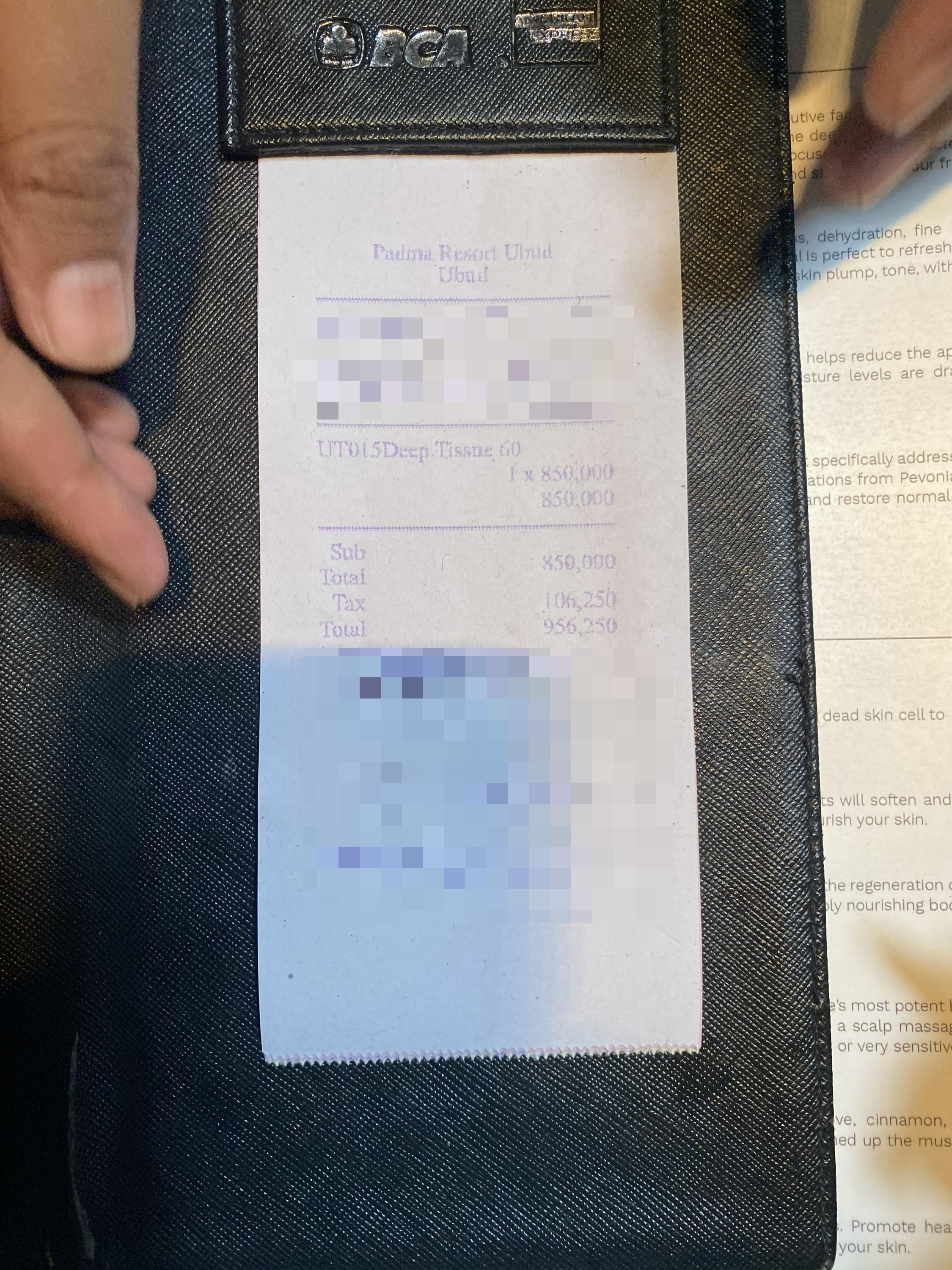 부가세까지 포함해서 약 956,000 IDR 정도 나왔고 체크아웃 때 계산을 하겠다고 싸인만 하고 나왔습니다. 발리 마사지 가격에 비해서는 리조트기 때문에 당연히 가격대가 있었지만, 이정도 서비스에 마사지 실력이면 충분한 가격이였던 것 같습니다.