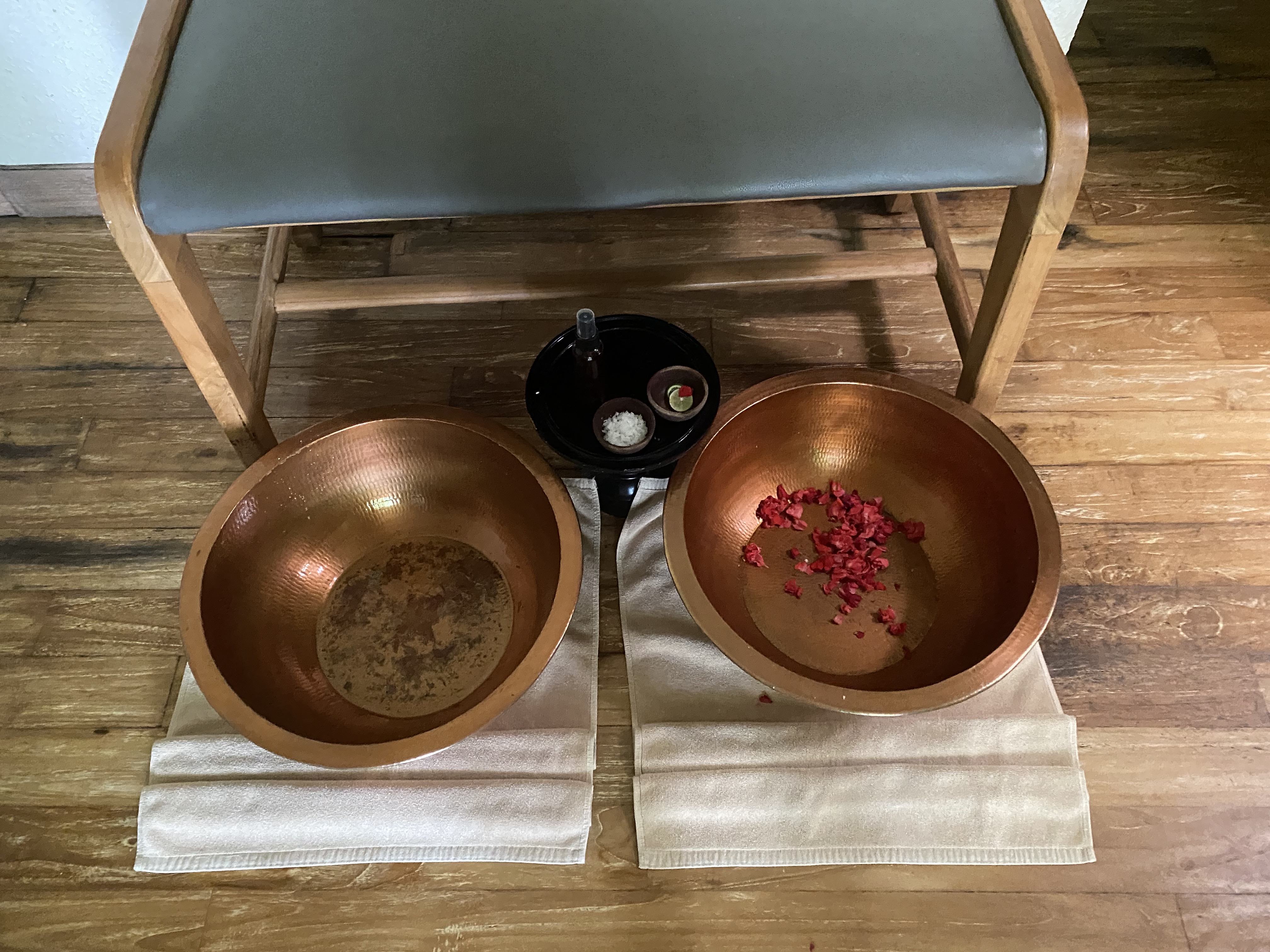 마사지 전에 오일과 꽃잎을 넣어서 이 곳에서 발을 닦아주십니다.