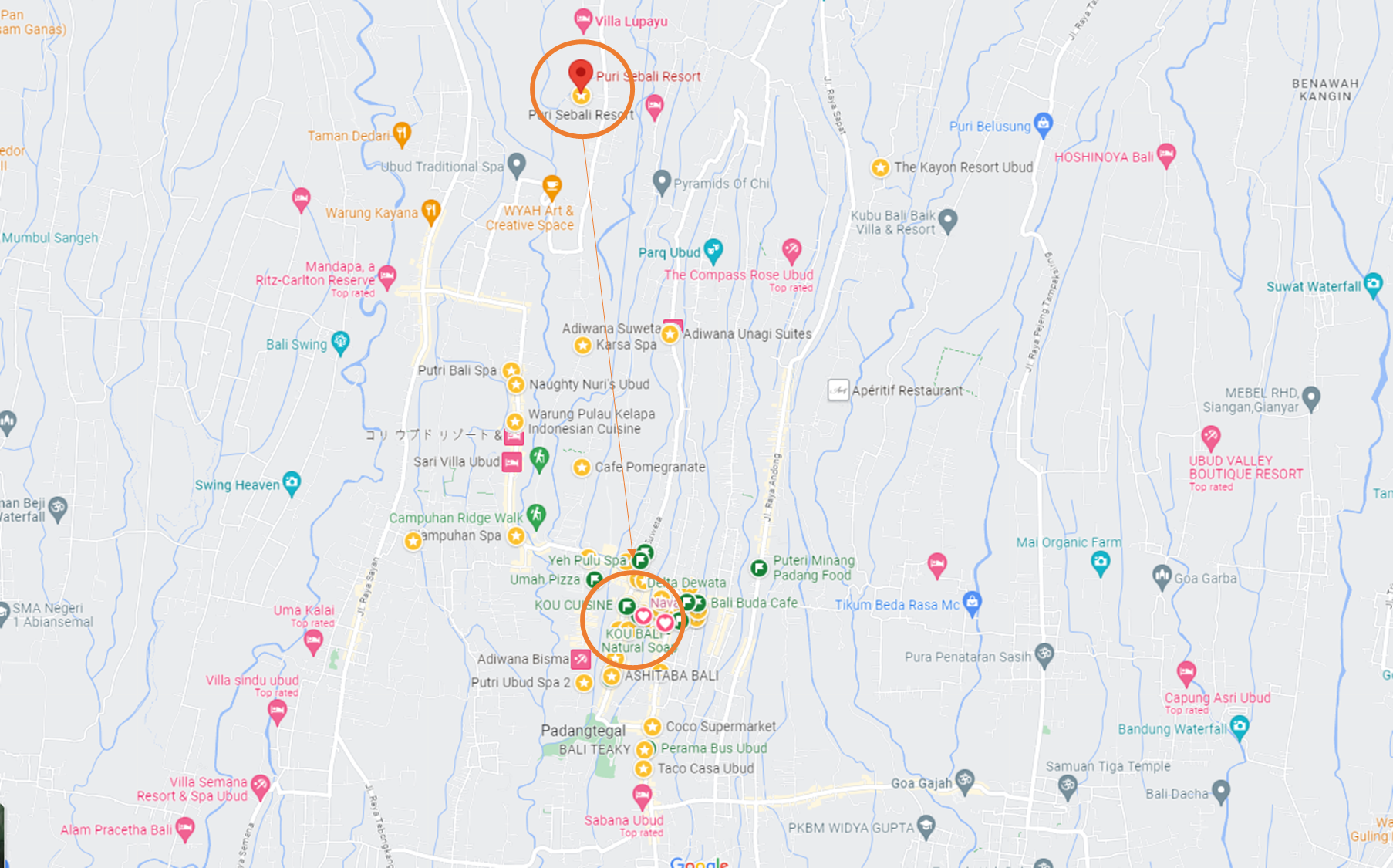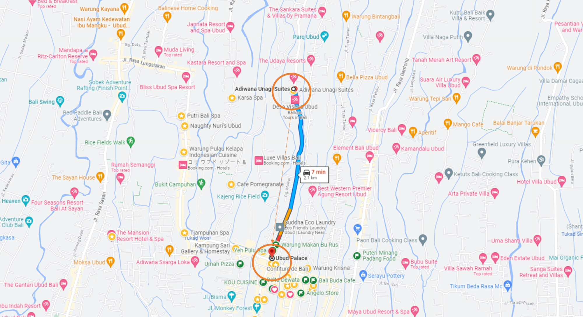 아디와나 우나기의 큰 장점은 리조트를 즐기면서도 우붓과 먼 거리에 떨어져 있지 않다는 점입니다. 우붓시내까지 택시로 7분 정도 걸립니다. (물론 셔틀도 제공됩니다.)